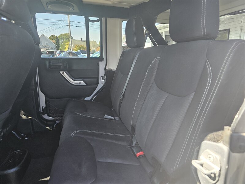 As for factory default features, this Jeep Wrangler Unlimited Sahara comes with off-road capabilities, iconic Jeep styling, four-wheel drive, a smooth-shifting automatic transmission, durable cloth upholstery, air conditioning, power windows, keyless entry, cruise control, a capable sound system, and multiple airbags for safety.