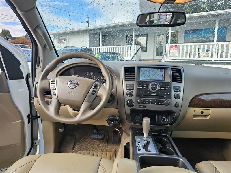 Introducing the 2014 Nissan Armada Platinum, a spacious and powerful full-size SUV designed to meet the needs of families and adventurers alike. Under the hood, this vehicle is equipped with a robust 5.6L V8 engine, delivering an impressive 317 horsepower and 385 lb-ft of torque. This performance ensures that you have the power necessary for towing, hauling, or simply enjoying a smooth ride.